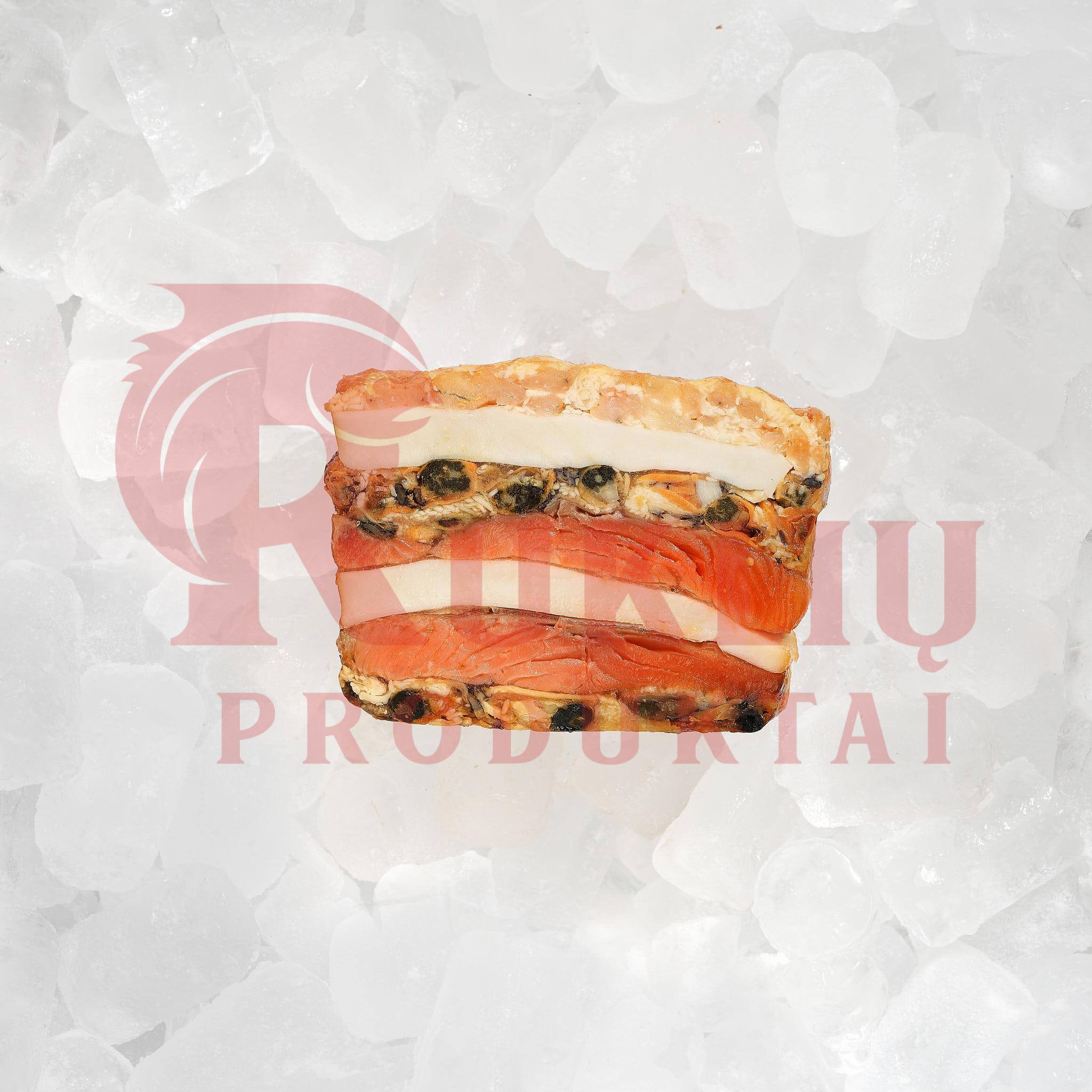 Šaltai rūkytas žuvies tortas – sluoksniuotas užkandis, kuriame vienu metu atsiskleidžia keli skoniai. Pagrindą sudaro švelnesnis, riebesnis upėtakis, suteikiantis minkštą ir lengvai salstelėjusį „žuvinį“ skonį. Krevetės įneša subtilaus saldumo ir lengvos jūros gaivos, midijos suteikia sodresnį poskonį, o kalmaras papildo tekstūrą lengvu elastingumu ir švariu užbaigimu. Viršuje esantis sūrio sluoksnis suteikia kremiškumo ir sujungia visus ingredientus į harmoningą visumą.